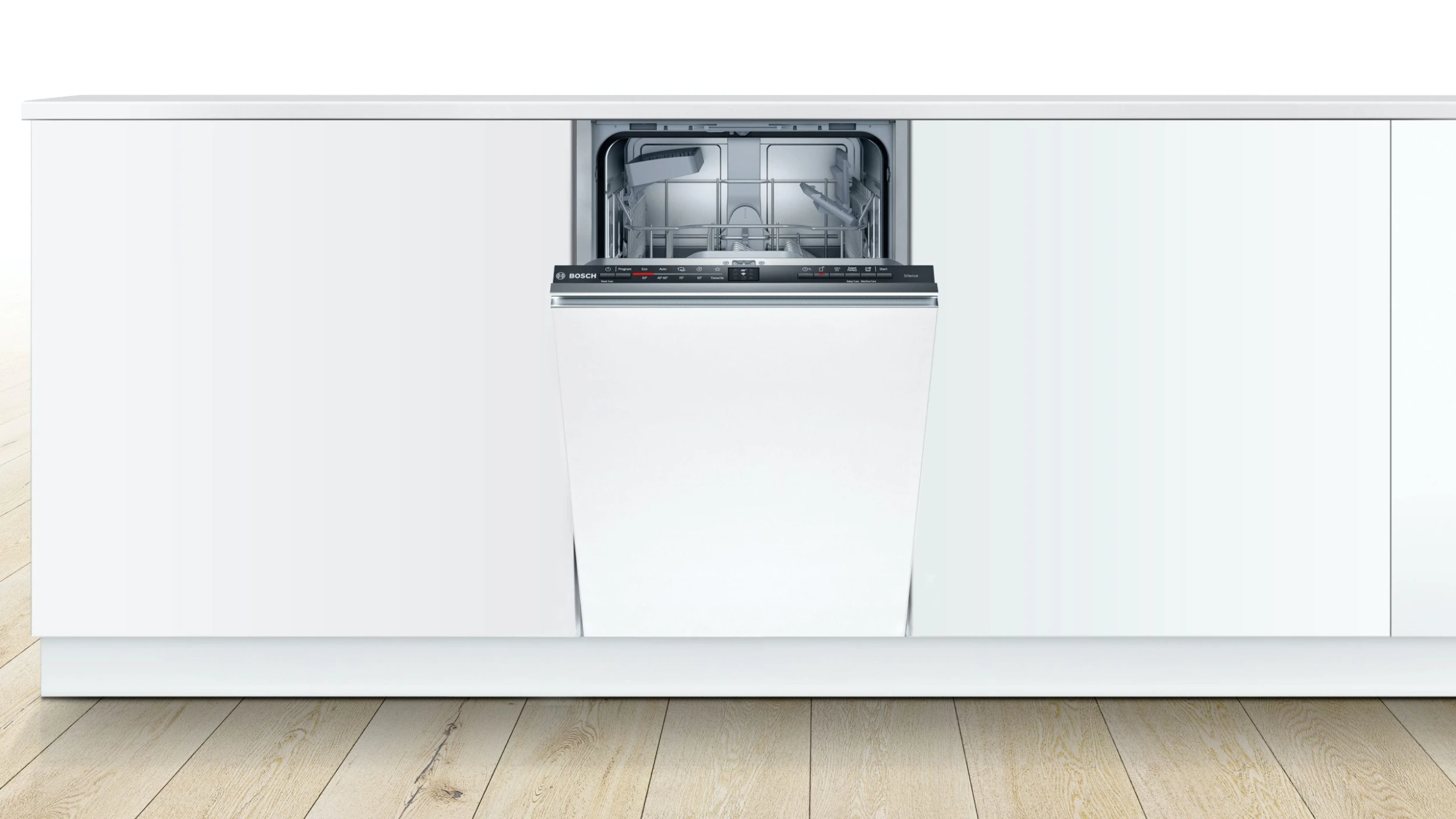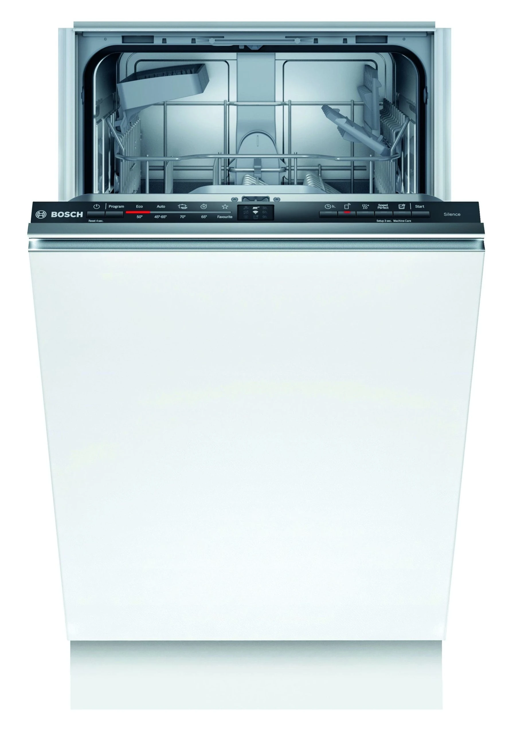Bosch Serie 2 SPV2IKX10E. Geräteplatzierung: Voll integriert, Produktgröße: Single (45 cm breit), Bedienfeld Farbe: Schwarz. Anzahl Maßgedecke: 9 Maßgedecke, Lärmemissionsklasse: C, Geräuschpegel: 48 dB. Höhenverstellbare Füße: 6 cm, Control Apps werden unterstützt: Siemens Home Connect. Energieeffizienzklasse: F, Wasserverbrauch pro Zyklus: 9,5 l, Energieverbrauch für 100 Zyklen: 78 kWh. Breite: 448 mm, Tiefe: 550 mm, Höhe: 815 mm