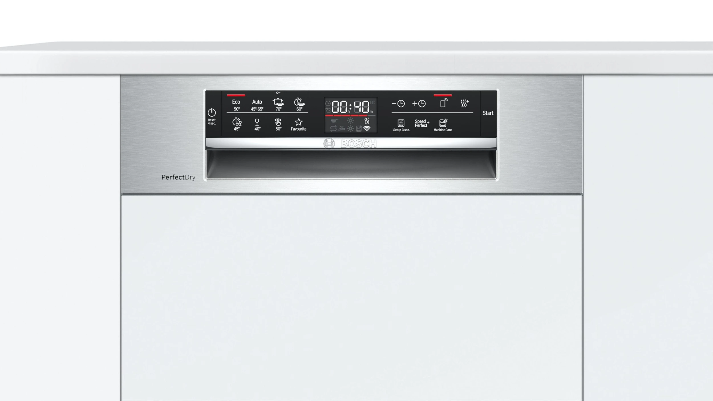 Bosch Serie 6 SPI6ZMS35E. Geräteplatzierung: Halb integriert, Produktgröße: Single (45 cm breit), Bedienfeld Farbe: Edelstahl. Anzahl Maßgedecke: 10 Maßgedecke, Lärmemissionsklasse: B, Geräuschpegel: 43 dB. Höhenverstellbare Füße: 6 cm. Energieeffizienzklasse: C, Wasserverbrauch pro Zyklus: 9,5 l, Energieverbrauch für 100 Zyklen: 59 kWh. Breite: 448 mm, Tiefe: 573 mm, Höhe: 815 mm