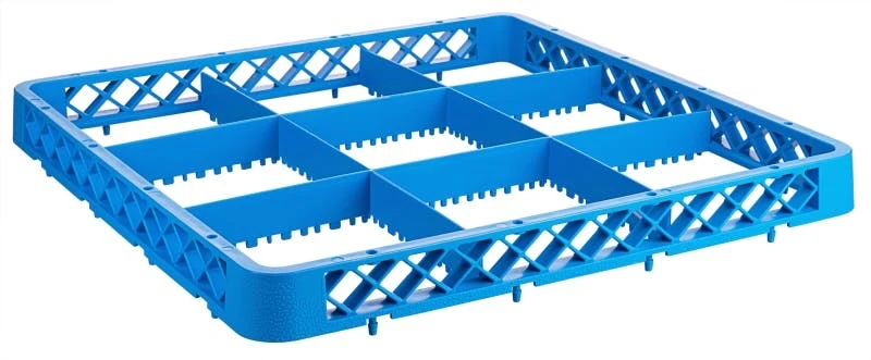 Geschirrspülkorb GLAS/TASSE, mit Facheinteilung aus hellgrauem Polypropylen, DIN 66075-F (50 x 50 cm), stapelbar, hitzeresistent bis +120°C, durch blaue Aufsätze lässt sich die Nutzhöhe um jeweils 4 cm erweitern