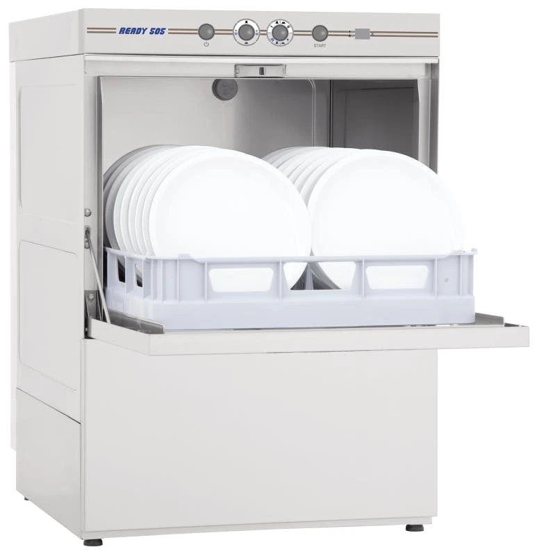 Kompakte Geschirrspülmachine Innen und Außen aus CNS 18/10 mit Klarspülmitteldosiergerät, Reinigungsmitteldosiergerät, Laugenpumpe mit einer max. Einschubhöhe von 365mm, 2 Spülprogramme, Thermostopp und Water-Fresh Filtersystem, automatische Wasserniveauregulierung und Teiltankwasserwechsel, inkl. 2x Universalkorb je 500×500 mm und 1x Besteckköcher aus Kunststoff 105x105x140mm.