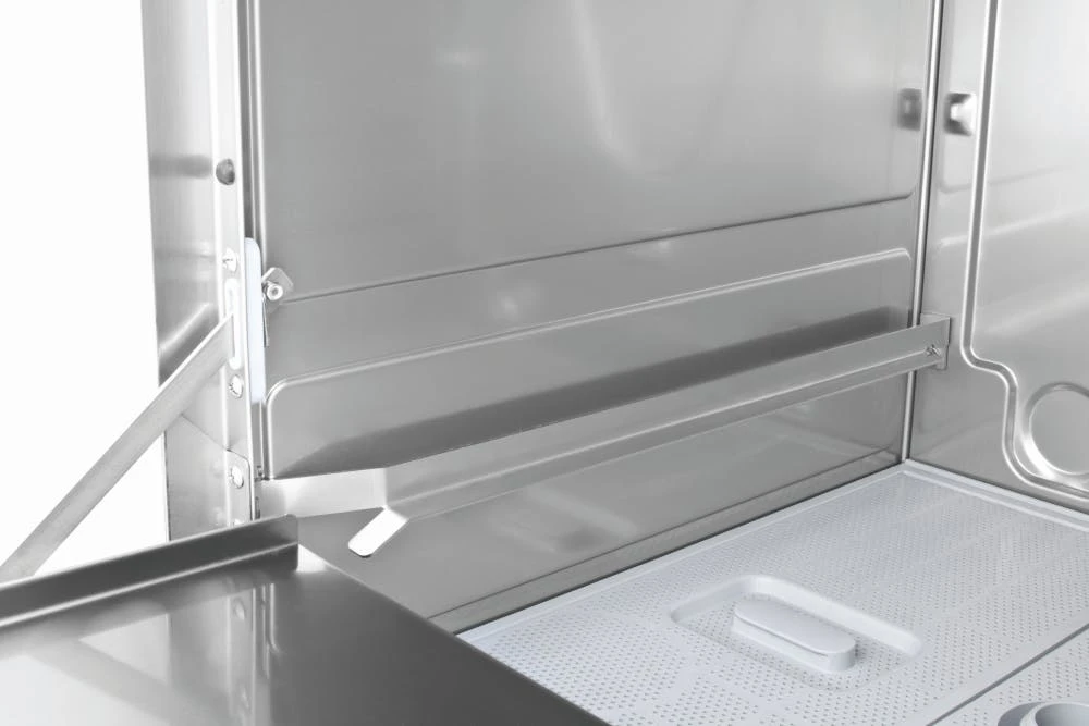 Kompakte Gläserspülmaschine elektromechanisch Innen und Außen aus CNS 18/10 mit Klarspülmitteldosiergerät, Reinigungsmitteldosiergerät, Laugenpumpe und automatischen Teiltankwasserwechsel. 1 Spülprogramm 120 Sekunden, Thermostopp und Double Flow Pumpe, inkl. 2x Neutralkörbe und 1 Besteckkorb aus Kunststoff.