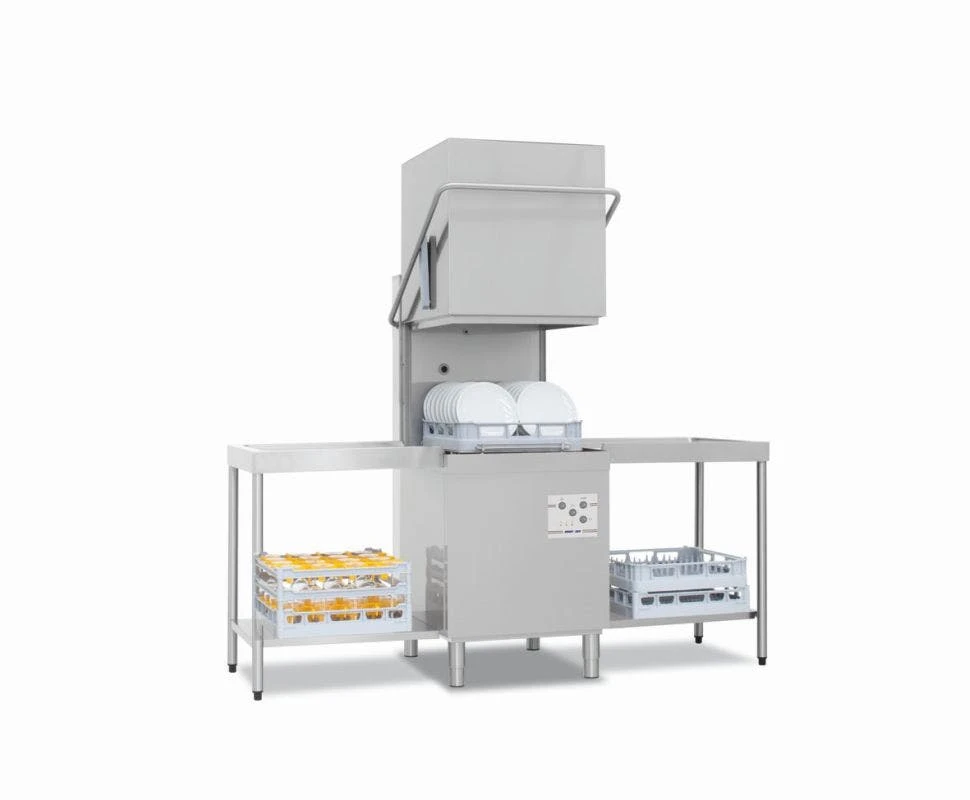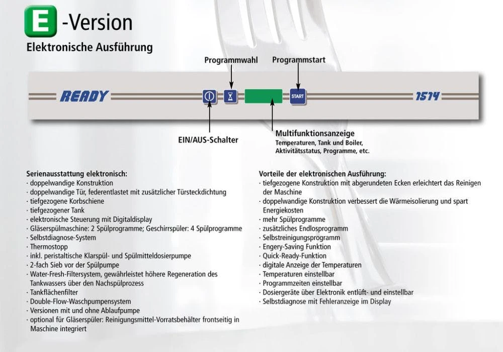 Elektronisch gesteuerte Durchschub-Spülmaschine für Geschirr mit Klarspülmitteldosiergerät und Reinigungsmitteldosiergerät mit max. Einschubhöhe 465mm + GN 1/1