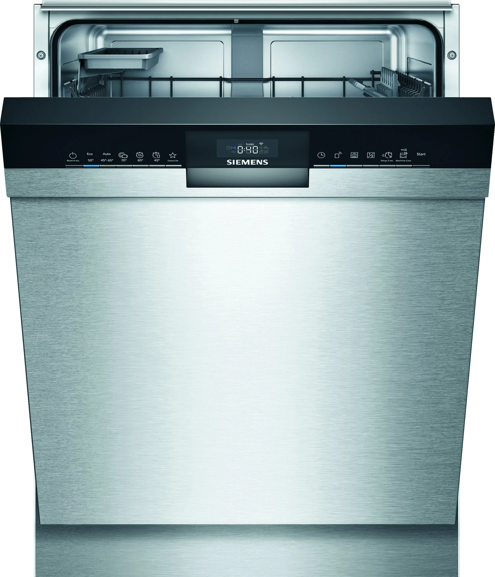 Siemens iQ300 SN43HS60AE. Geräteplatzierung: Unterbau, Produktgröße: Standardgröße (60 cm), Türfarbe: Edelstahl. Anzahl Maßgedecke: 13 Maßgedecke, Lärmemissionsklasse: B, Geräuschpegel: 44 dB. Höhenverstellbare Füße: 6 cm. Energieeffizienzklasse: D, Wasserverbrauch pro Zyklus: 9,5 l, Energieverbrauch für 100 Zyklen: 84 kWh. Breite: 598 mm, Tiefe: 573 mm, Höhe: 815 mm